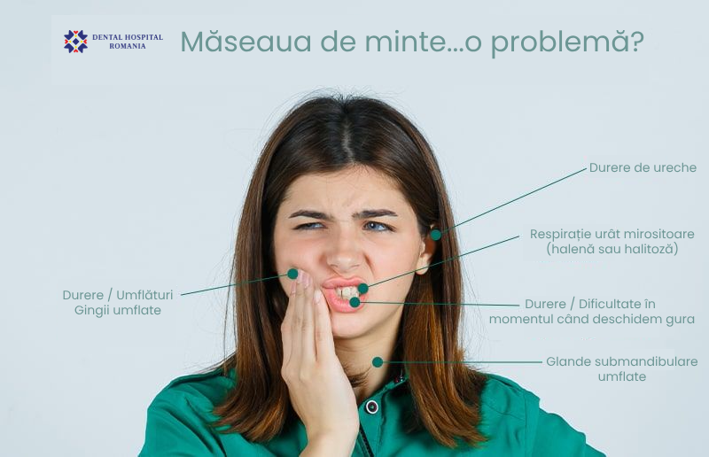 Un alt simptom frecvent este inflamația gingiilor în jurul măselei de minte. Gingiile pot deveni roșii, umflate și sensibile la atingere. În cazuri severe, poate apărea chiar o pungă de puroi, semn că o infecție s-a instalat și necesită tratament medical.