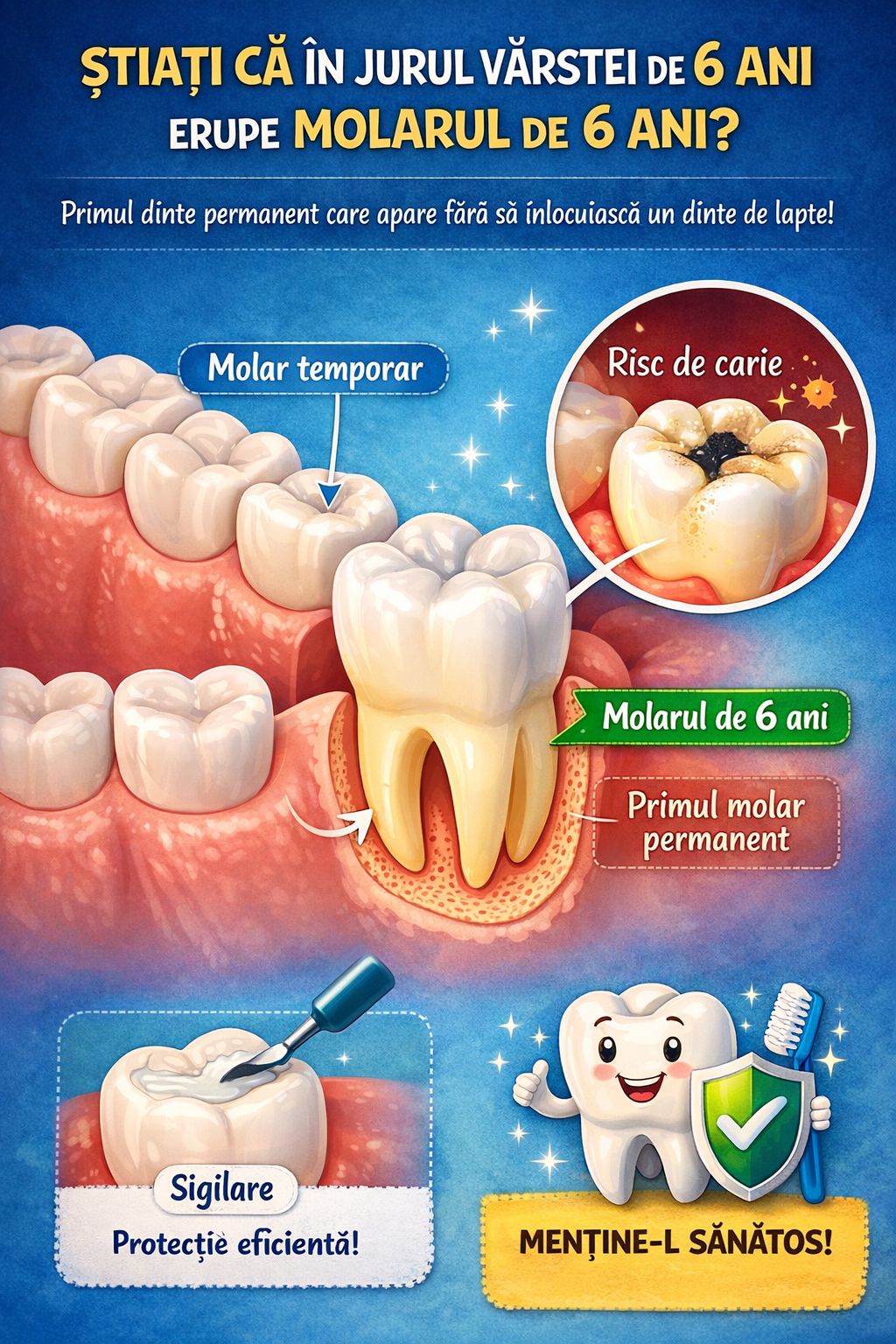 Primul molar permanent este un dinte-cheie în dezvoltarea sănătoasă a danturii copilului. Pentru că nu înlocuiește un dinte de lapte, apariția lui poate trece ușor neobservată, iar riscul de carie este crescut imediat după erupție.